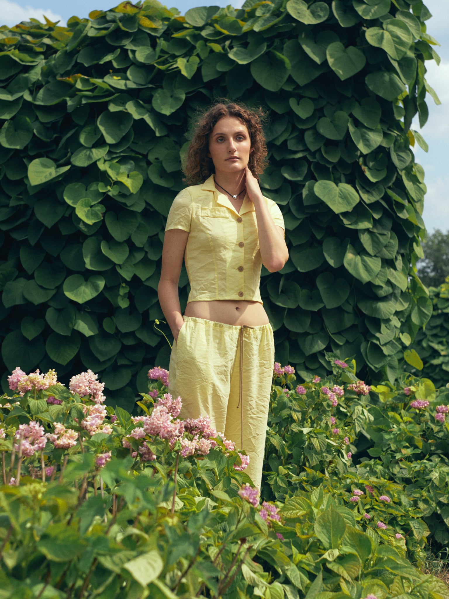Вкорочений жакет з відкладним коміром і короткими рукавами. Застібка на гудзики спереду. Представлений в рожевому та жовтому кольорах. Поєднуйте жакет з рожевими брюками або спідницею з низькою посадкою з цієї колекції.