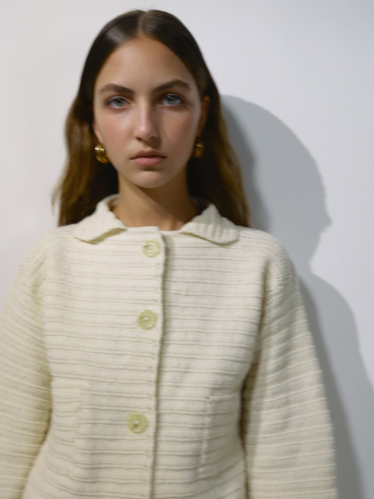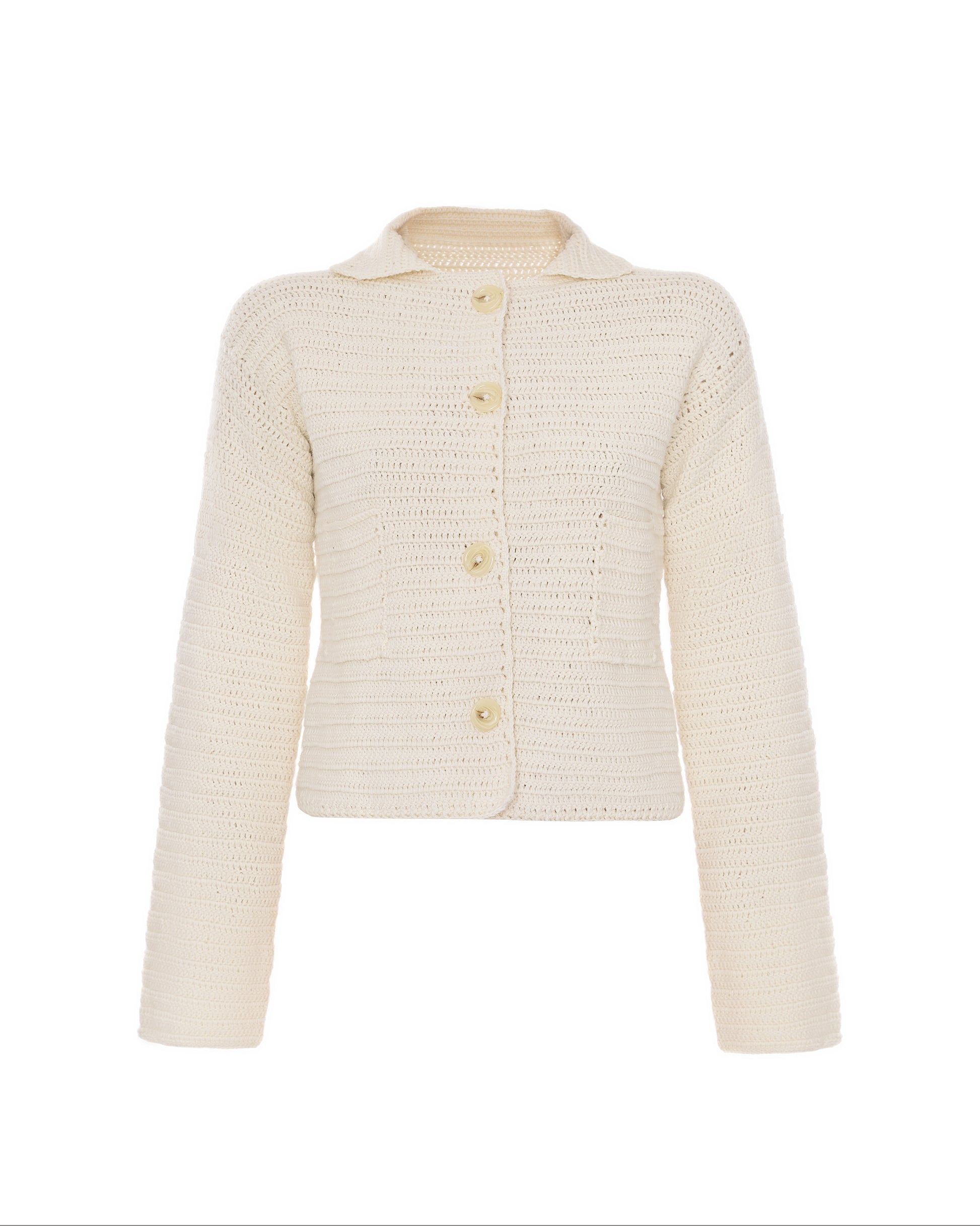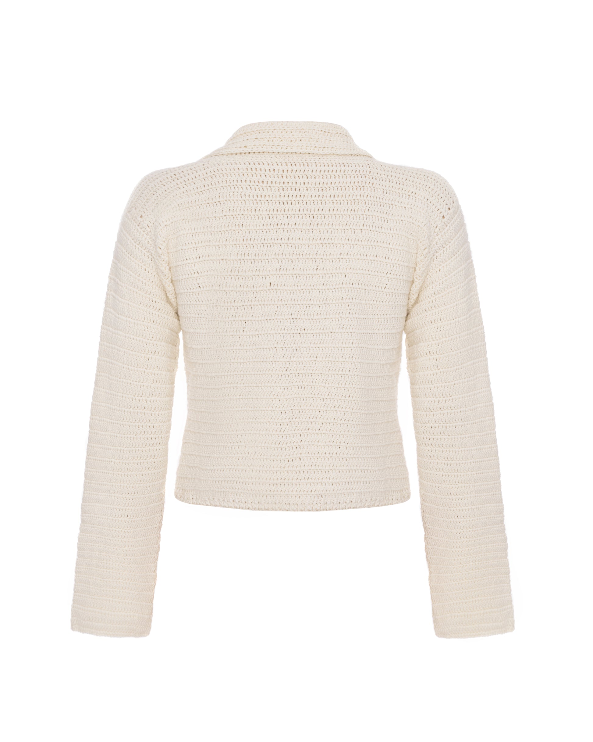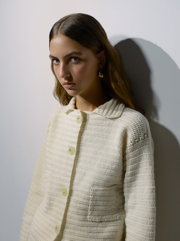 Ручна в'язка крючком із пряжи вовни мериносу. Дві накладні кишені та відкидний комір. Рекомендуємо носити костюмом у парі з спідницею із такої самої пряжі.
