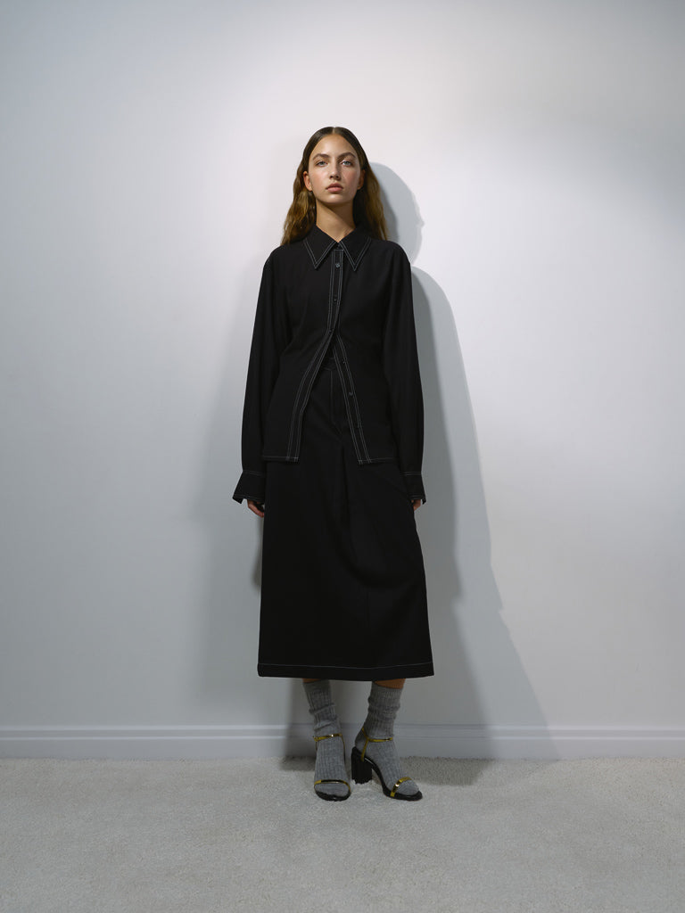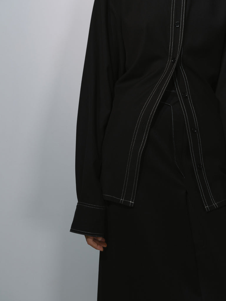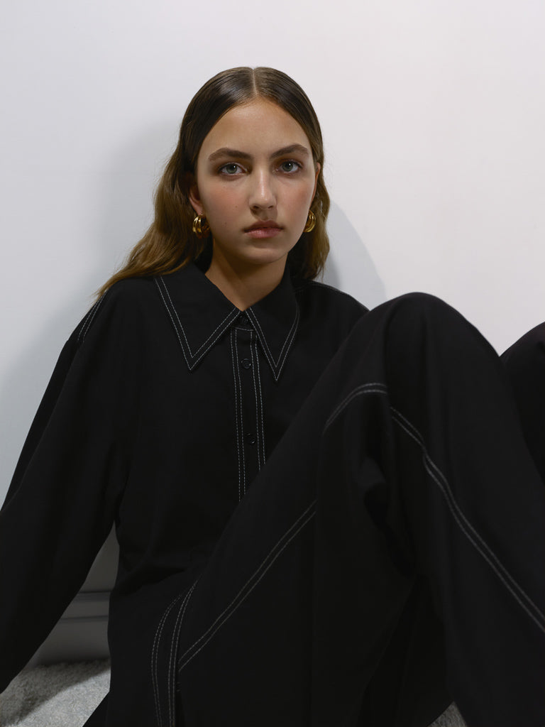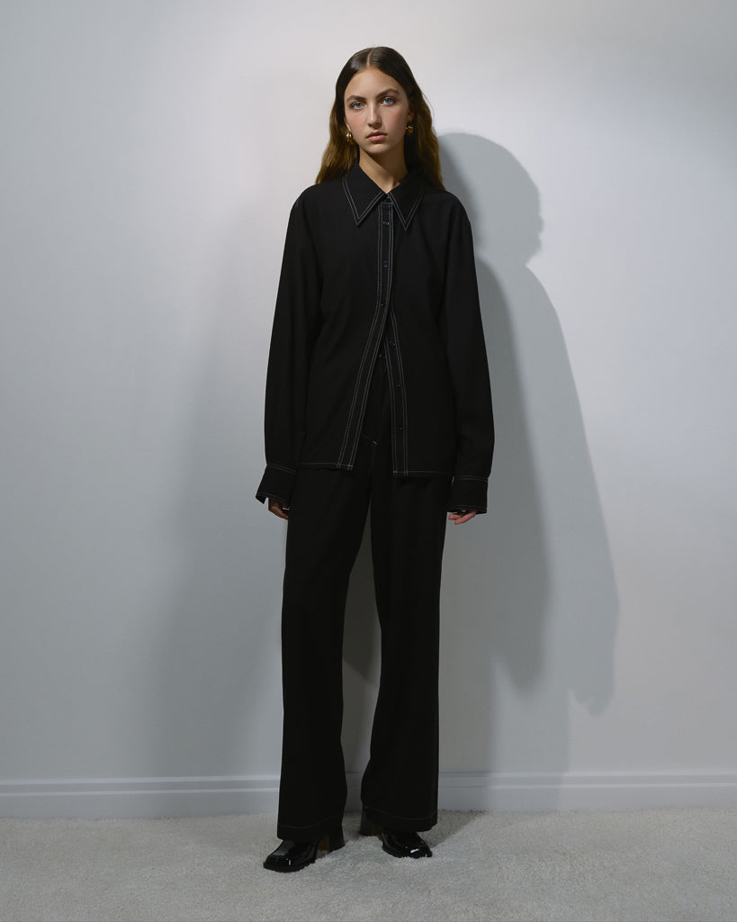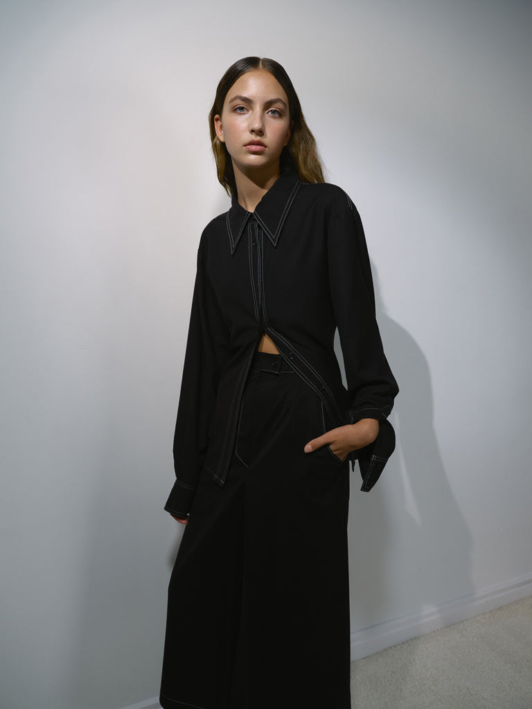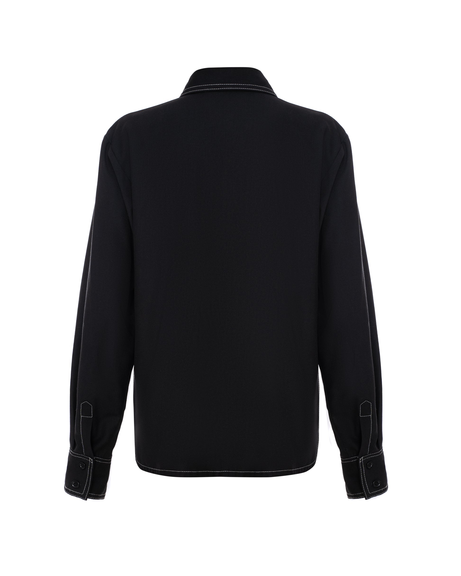 Сорочка прямого крою з класичним коміром, довгим рукавом та манжетом. Чорний колір з акцентним білим стібком. Рекомендуємо носити у костюмі з штанами із акцентним стібком або вовняною спідницею.