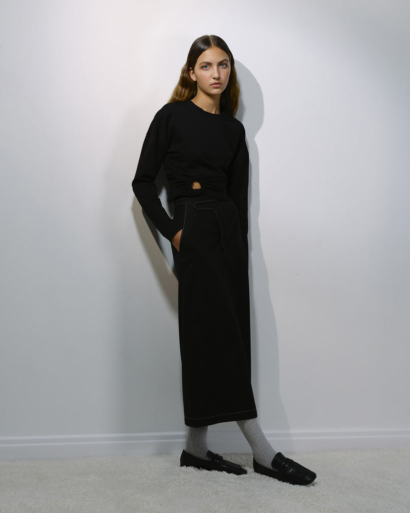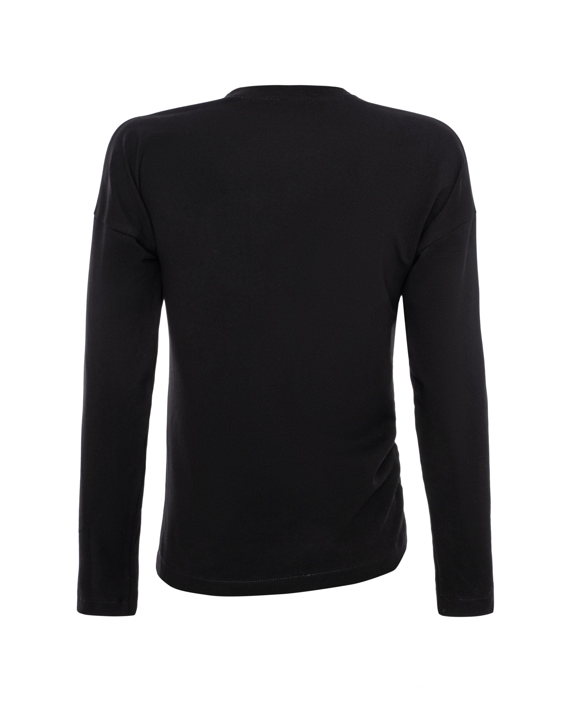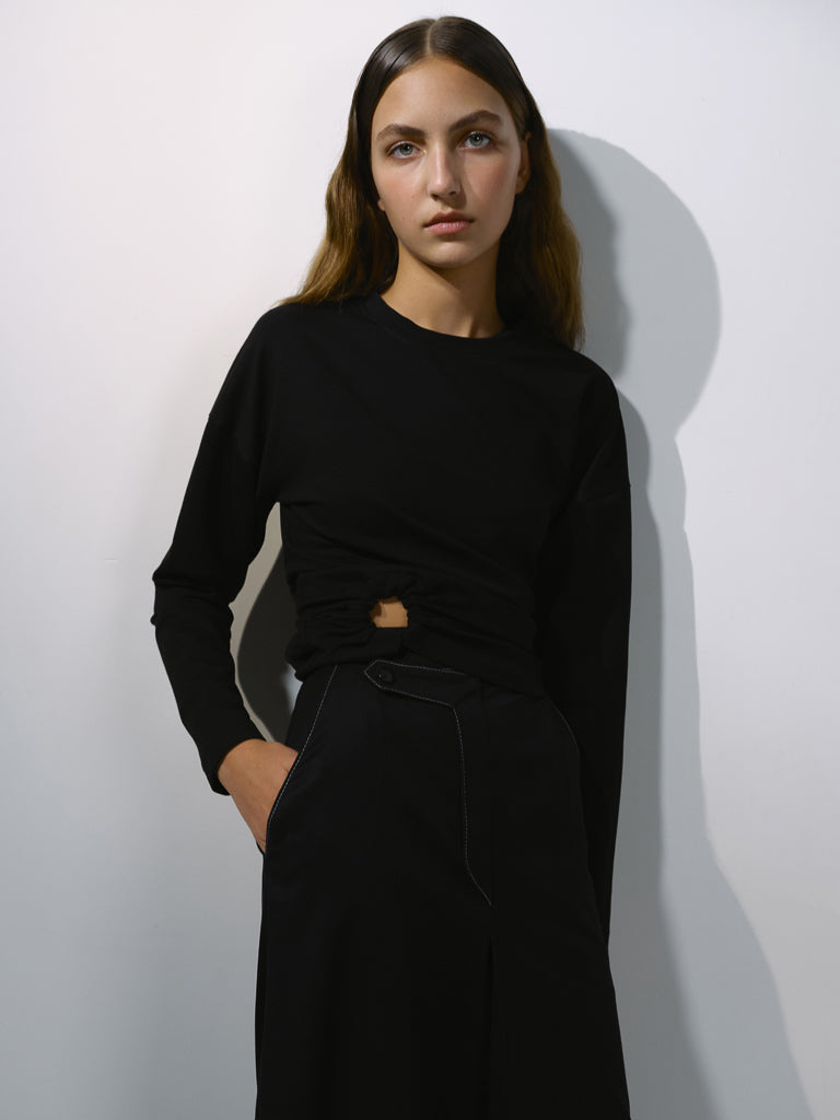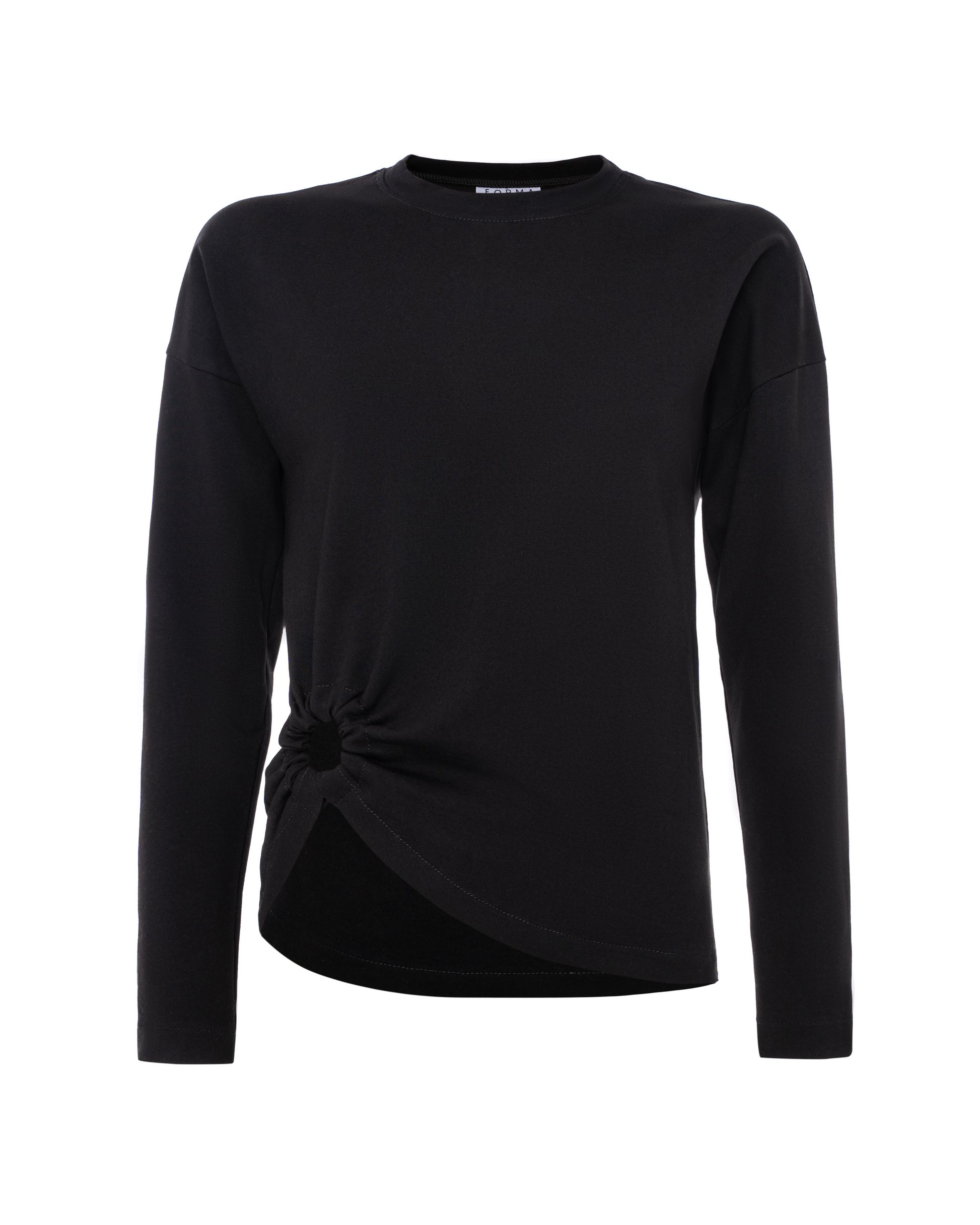 Лонгслів з металевим аксесуаром - кільцем. Акцентні склади збоку. Рекомендуємо поєднувати з спідницею із контрастним стібком.