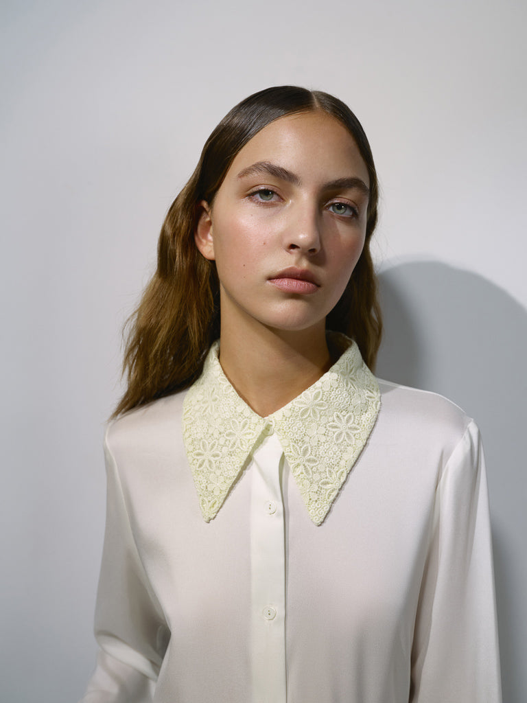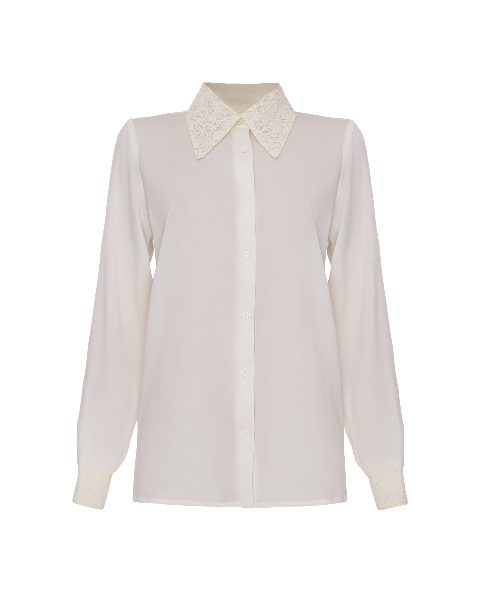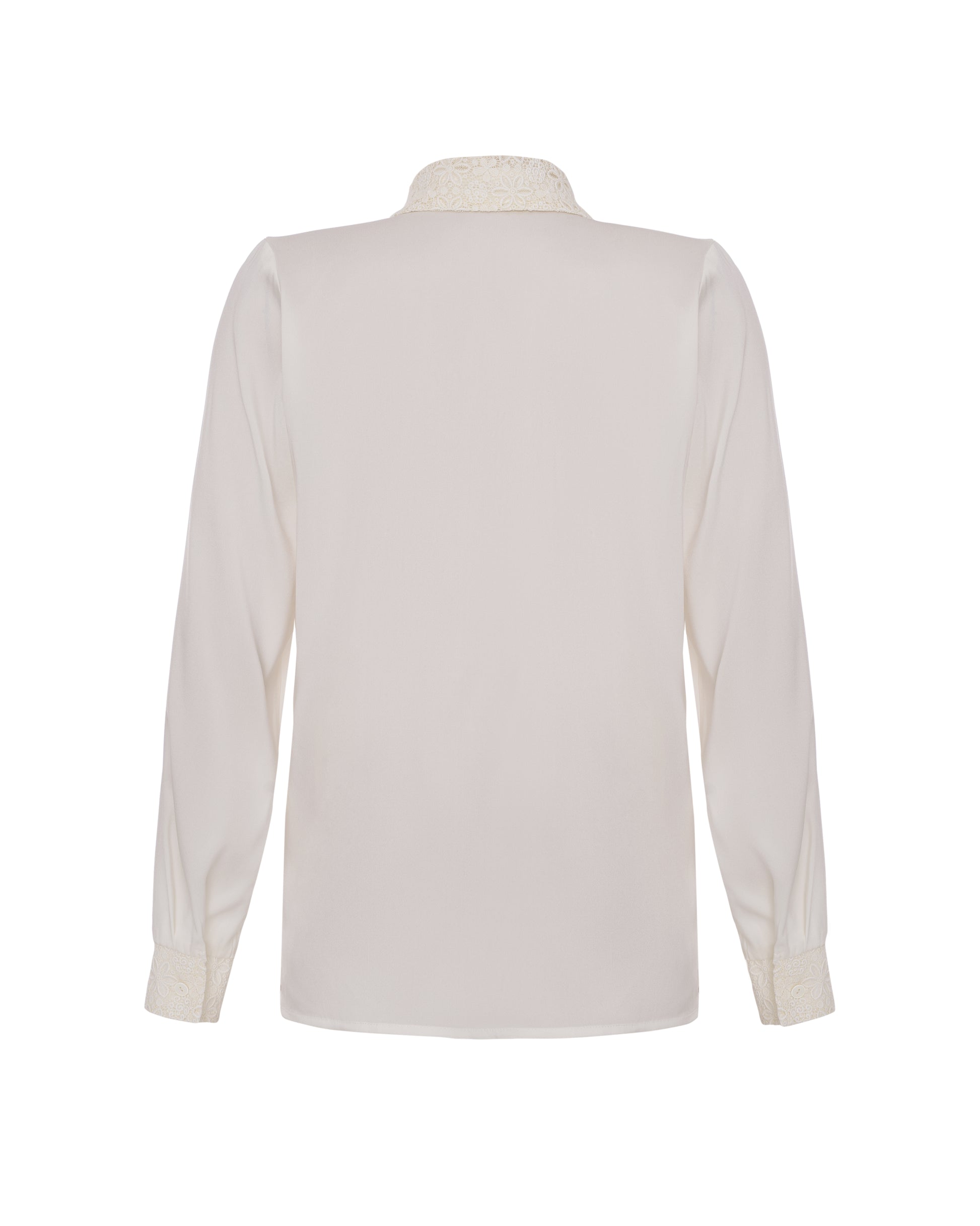 Виріб із шовку. Молочна сорочка з акцентним коміром та манжетом, які виготовлені з мережива. Рекомендуємо поєднувати з брюками із еко-шкіри та костюмним жилетом.