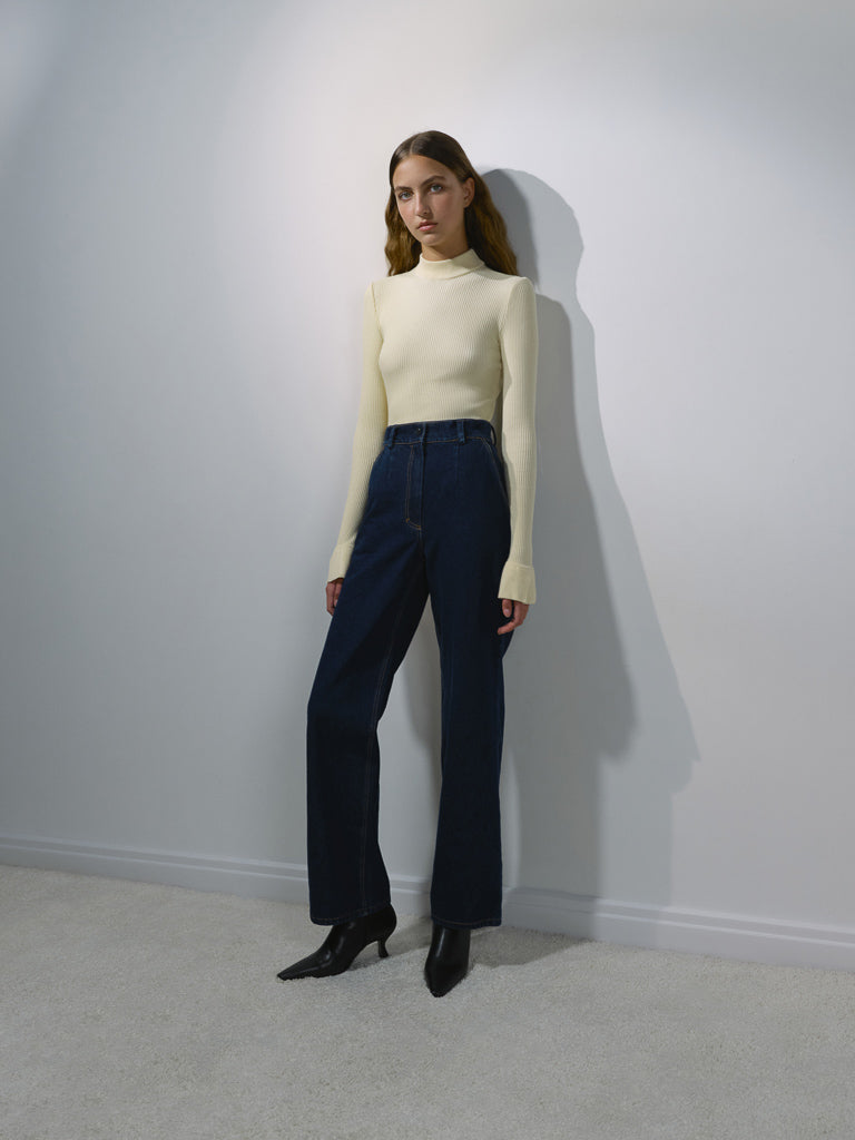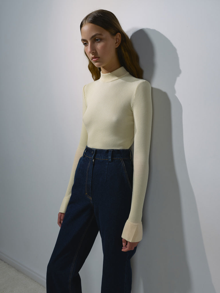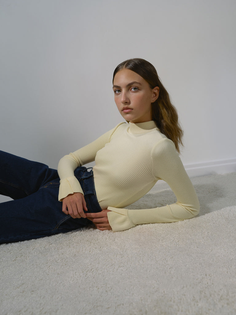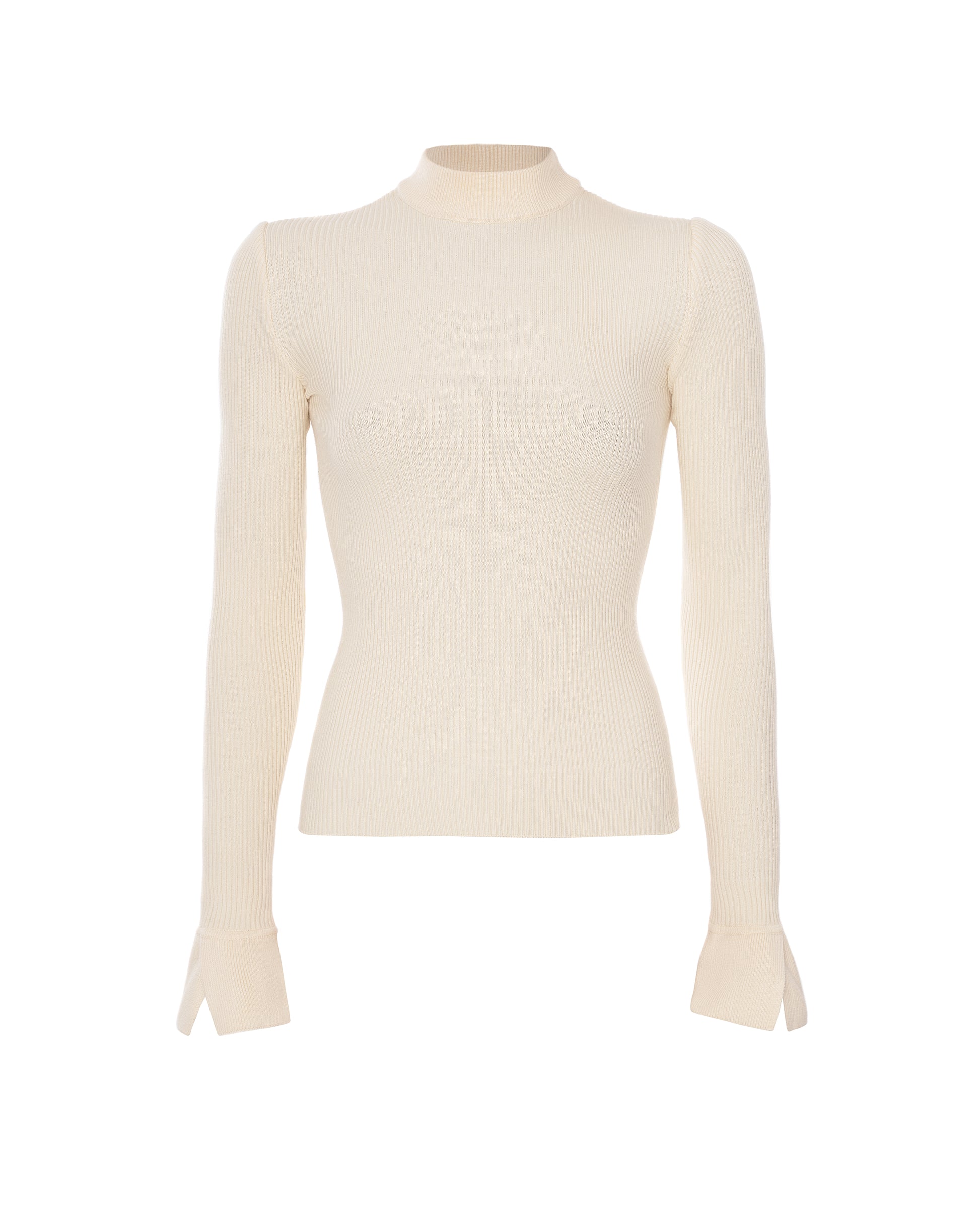 Светр молочного кольору з extra-довгим рукавом із манжетом. Рекомендуємо носити у парі з джинсами прямого крою або вовняною спідницею.